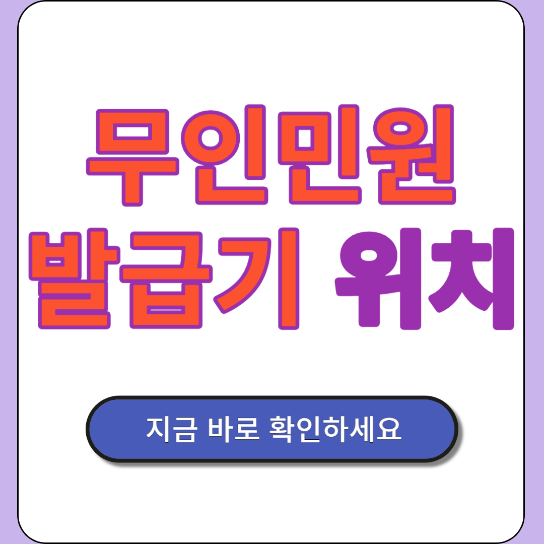 긴급하게 서류를 발급받아야 할 상황에서 무인민원발급기를 모르고, 멀리 있는 관공서를 찾아가는 실수를 했었는데요. 집과 가까운 무인민원발급기 위치를 확인하시면, 근처에서 간편하게 민원서류를 발급받을 수 있습니다. 아래에서 가까운 무인발급기 위치를 확인하시기 바랍니다.