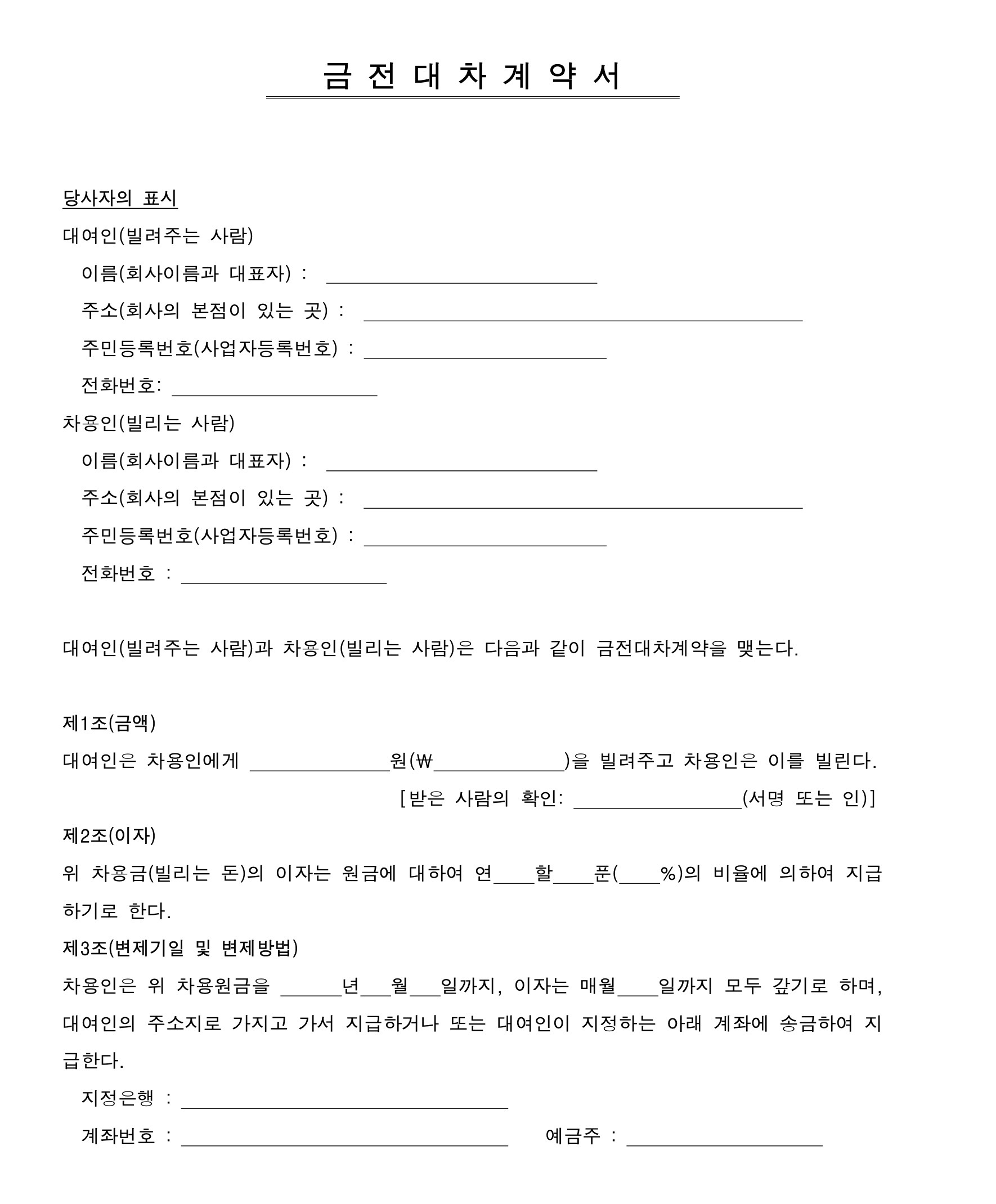 당사자 정보 기록: 차용증에는 빌린 사람(채무자), 빌려준 사람(채권자), 그리고 필요한 경우 보증인(대신 갚을 사람)의 정보를 명확하게 적어야 합니다. 이름, 주소, 전화번호 등을 포함해야 합니다.